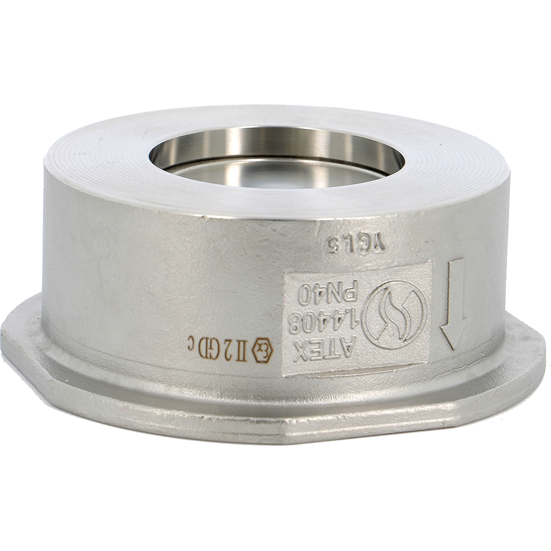 Wafer rugós saválló acél visszacsapószelep ATEX minősítéssel, ipari alkalmazásokra.