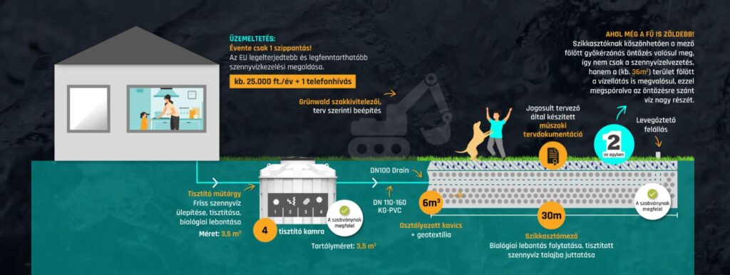 A megfelelő engedélyekkel rendelkező áramellátás nélküli biológiai szennyvíztisztító rendszer innovatív és korszerű. Piacon egyedülálló 4 kamrás oldómedencével a jobb ülepítési hatásfok és a szikkasztó élettartamának növelése érdekében.Az ülepített szennyvíz egy megfelelően méretezett szikkasztómezőbe folyik, ahol a biológiai folyamatok végbemennek, majd a tisztított szennyvíz elszivárog a talajban.