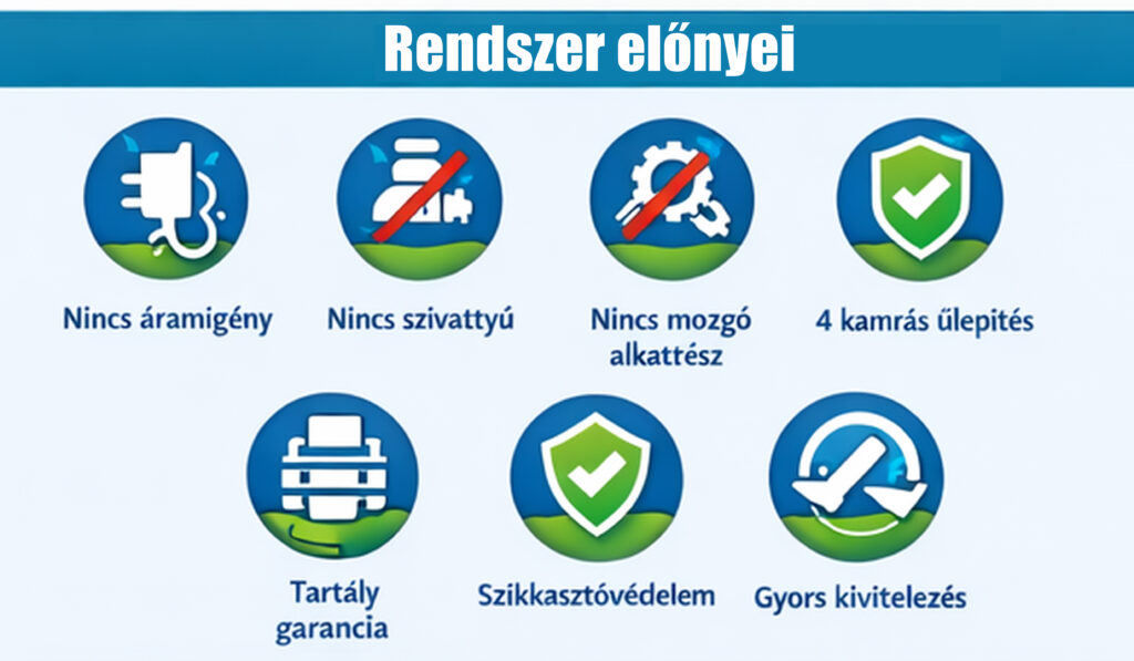 – Szikkasztó domb kiépítése vagy speciális szikkasztó kialakítása talajviszonyoktól függően. És az ehhez tartozó szennyvízszivattyú, vezérléssel. (ebben az esetben nem lehet áramforrás nélkül telepíteni)