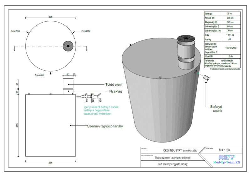 Kommunális és ipari szennyvíz befogadására talajsík alá süllyeszthető zárt tároló. A hatósági megfelelőség és vízzáróság alapvető feltétele a nemzeti műszaki értékelés megléte, ami alapján egy zárt tároló CE jelzéssel ellátható, hatóságilag megfelelő. Szennyvíztartály esetén két feltételnek kell teljesülnie, minősített tartály és szakmailag képzett telepítő kivitelezői nyilatkozata. A standard tartályok beépítése talajvízmentes környezetben lehetséges, terhelésük gyalogos forgalomra méretezett. A tartályhoz napelemes szintjelzős fedlapot biztosítunk, mely a telitettség visszajelzésére szolgál, így a tároló ürítése ütemezhető.